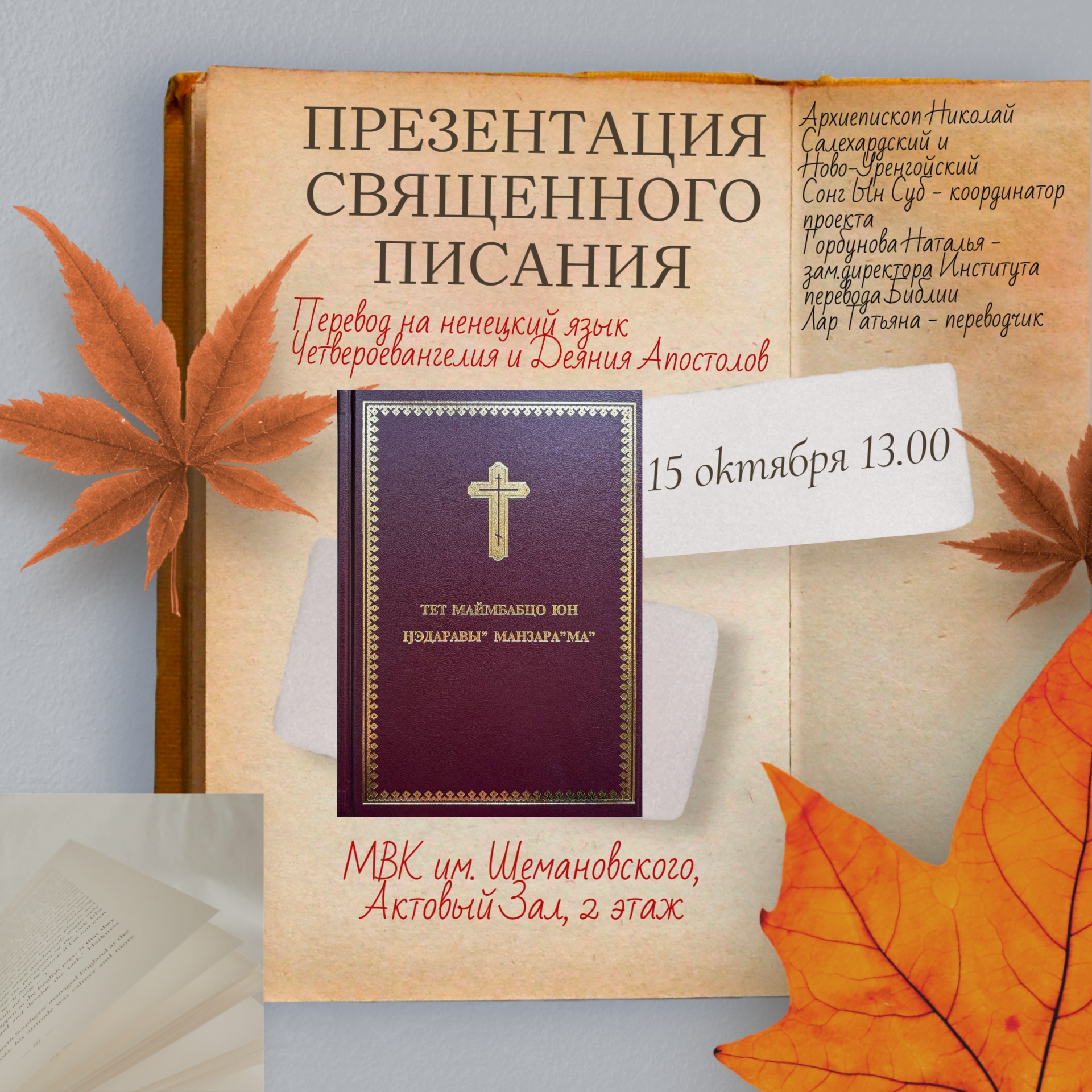 15 октября в 13:00 в актовом зале ОМВК имени И.С. Шемановского пройдет презентация уникального издания от Института перевода Библии на ненецком языке, включающего четыре Евангелия и Деяния святых апостолов. Издание открывается словами архиепископа Николая Салехардского и Ново-Уренгойского, подчеркивающего важность чтения Нового Завета для духовного развития верующих. Он отмечает, что перевод является результатом серьезной работы, требующей глубоких знаний в богословии и языках, а также любви к Слову Божьему и ненецкому народу. Ненцы — крупнейший коренной народ севера (около 45 тысяч человек), из которых лишь чуть более половины владеют языком. Христианство пришло к ним в XVIII веке через миссионеров Русской Православной Церкви. Издание отличается продуманным оформлением с национальным орнаментом и включает комментарии, глоссарий ключевых терминов и карты, помогающие понять географию библейских событий. Книга стала результатом работы команды специалистов по ненецкому языку и экспертов в библеистике, среди которых кандидаты наук и исполнители национального эпоса. Важную роль в проекте сыграла богословский редактор Сонг Ын Суб из Южной Кореи, которая прожила на Ямале 25 лет и хорошо владеет русским и ненецким языками. Благодаря её усилиям была обеспечена точность перевода, который получил положительные отзывы от носителей языка. Институт перевода Библии уже публиковал отдельные библейские тексты на ненецком языке и разработал мобильные приложения для распространения библейских знаний. В настоящее время продолжается работа над переводом других текстов.