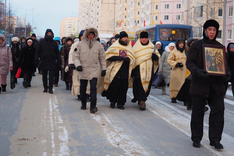 В праздник Богоявления Господня в храме в честь святителя Николая Чудотворца г. Надым были совершены богослужения. Вечером, 18 января - вечернее богослужение, и утром 19-го - Божественная Литургия. После богослужения настоятель Свято-Никольского храма иерей Михаил Флягин с диаконом Петром Акинфиным, а также настоятель храма-часовни в честь благоверного князя Александра Невского протоиерей Артемий Почекутов совместно с прихожанами прошли крестным ходом улицами города. На реке Надым было совершено Великое освящение воды. После завершения богослужений верующие смогли окунуться в подготовленной Иордани.