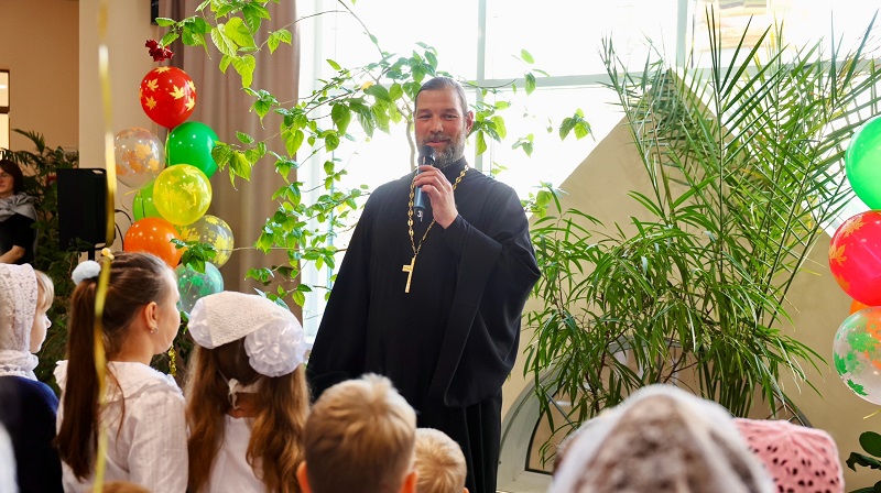 На торжественной линейке в здании Духовно-просветительского центра «Преображение» вся школа приветствовала 18 новичков. Настоятель храма иерей Тимофей Степаненко поздравил ребят с началом нового учебного года и поделился с ними духовными наставлениями.