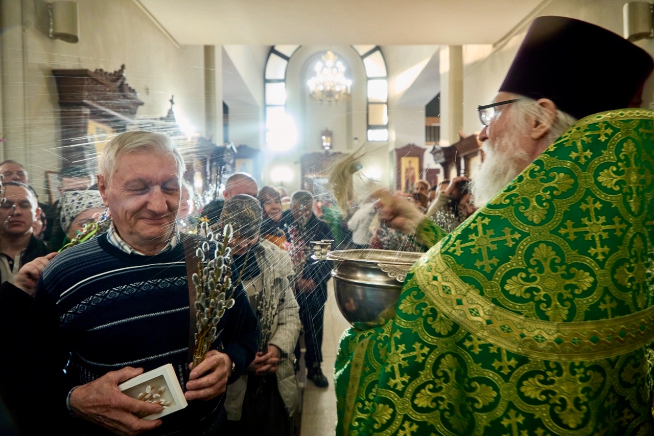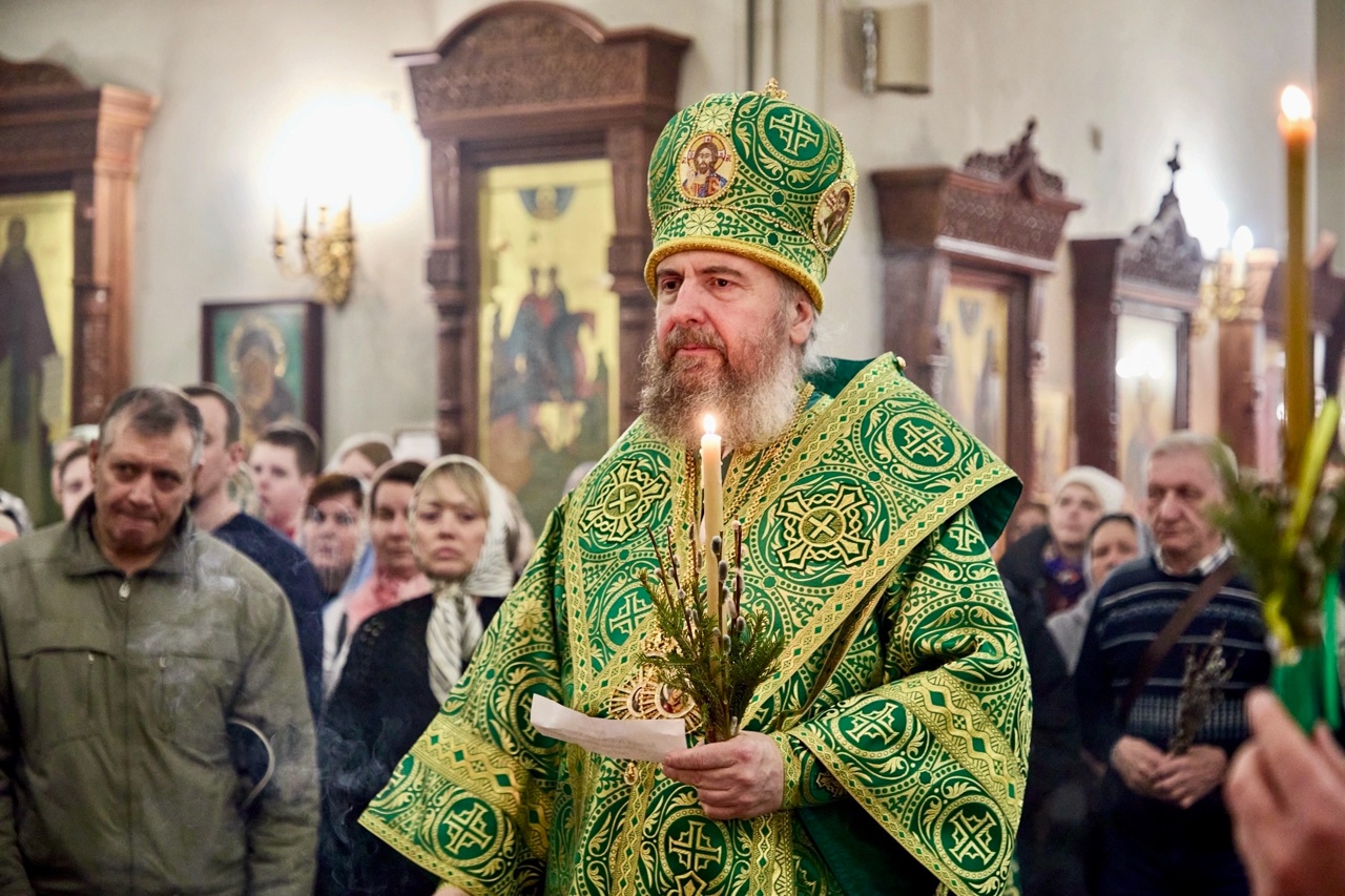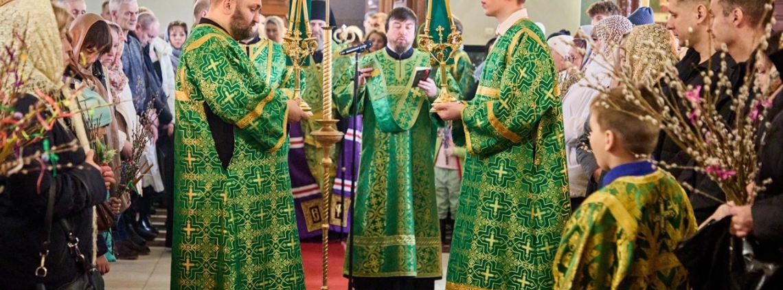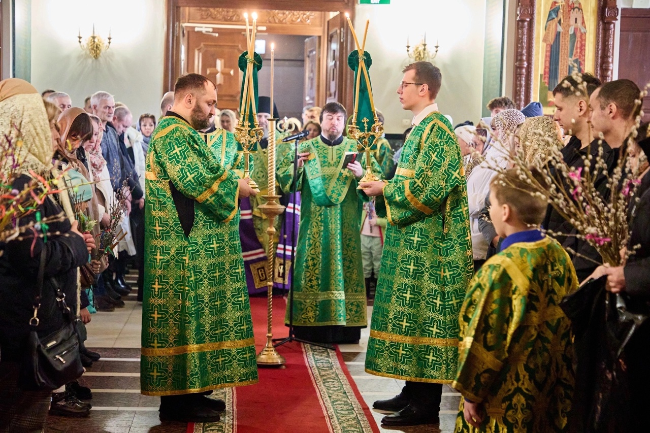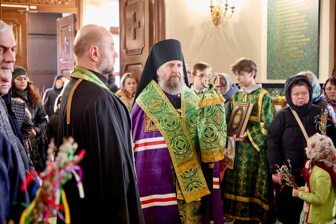 За всенощным бдением Входа Господня в Иерусалим было совершено первое освящение вербы: владыка прочитал молитву на освящение верб – символов победы жизни над смертью и окропил их освященной водой.