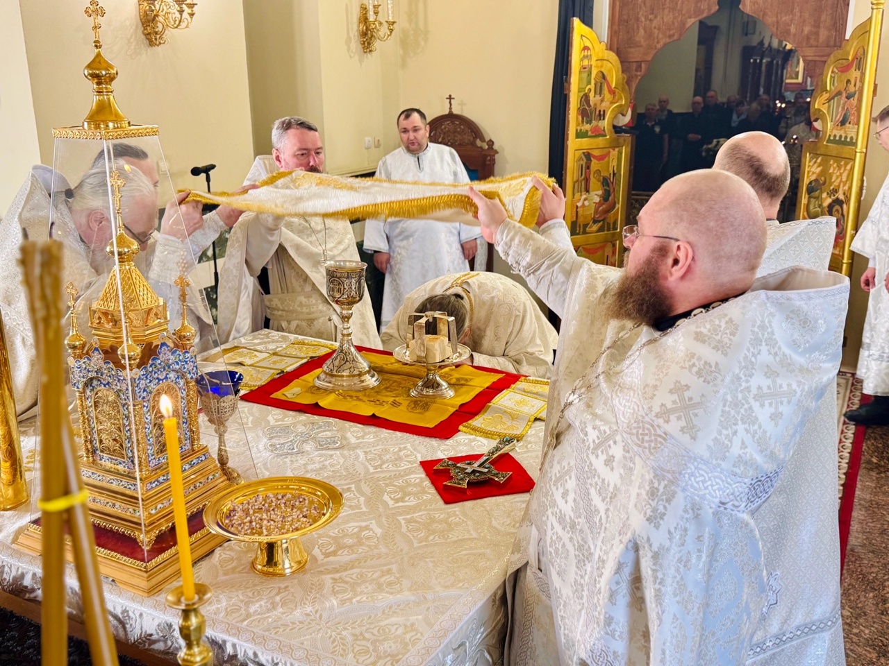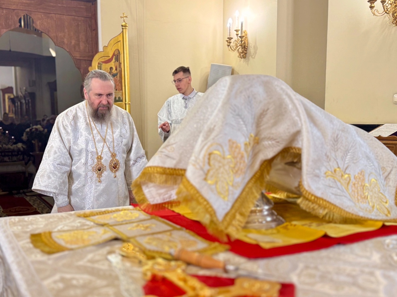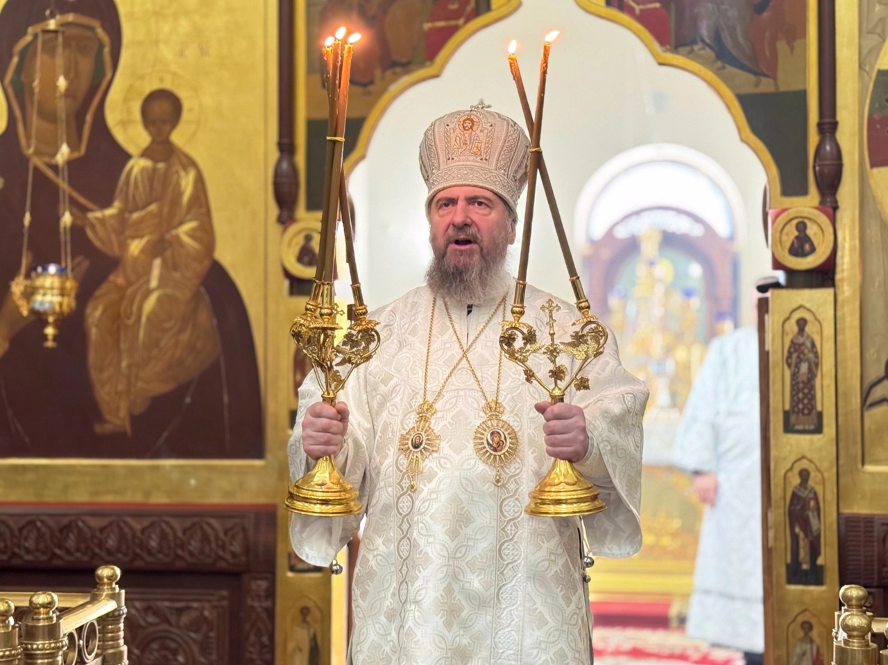 По заамвонной молитве владыка вместе со служащим духовенством совершил освящение хлеба и вина, после этого обратился к собравшимся в храме прихожанам с архипастырским словом, сугубо поздравил причастников с принятием святых Христовых Тайн и напомнил всем о значении сегодняшнего дня.