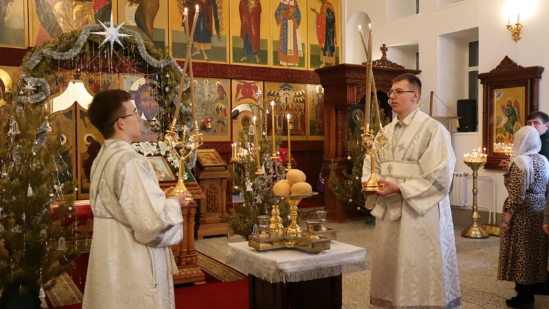 Владыка отметил, что вся жизнь человечества разделяется – до Рождества Христова, и – после. Боговоплощение является великой тайной – Господь умалился до человека, родившись от Приснодевы Марии. Далее Владыка сказал о том, что родившийся Богочеловек, Сын Божий Иисус Христос, является ходатаем за всех нас. Между Рождеством и Крещением Господним - Святки - святые дни, без суеты, время поразмышлять о душе и о Боге, о Промысле Божием о всех нас. Господь умалился до каждого, Родившись в пещере, хлеву, Он может войти и в пещерки наших сердец, если покаемся, и принять нас в число Своих друзей. Нам дано, отметил Владыка, великое Таинство – Тело и Кровь Христовы, Причастив, такое великое Родство. Пример для всех нас святой жизни во Христе – святые, как и ныне прославляемый святитель Василий Великий. Нам заповедано – радоваться. Радость – от чистоты сердца. Далее Владыка Николай пожелал всем радоваться о Господе и не унывать, в чем да поможет Господь.