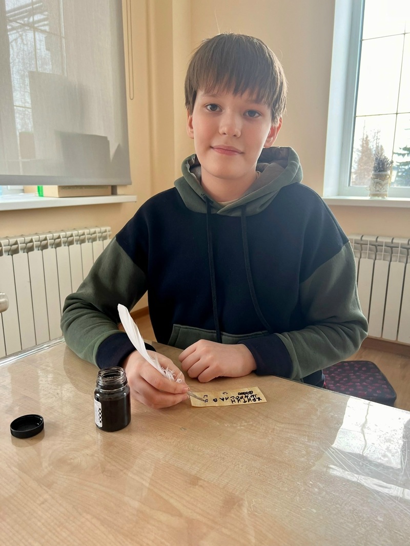 Дети создавали берестяные грамоты из настоящей бересты с помощью апельсиновой палочки, писали на папирусах гусиным пером и чернилами, тренировались выводить церковнославянские буквы. Каждое задание открывало им кусочек давней истории!